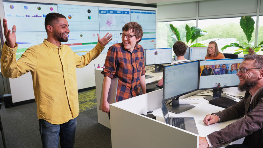 Praten, luisteren, meedenken: het maakt een belangrijk deel uit van het werk van Monique. “Maar ook mensen verbinden en enthousiasmeren, zowel binnen als buiten mijn team.” Dat team bestaat onder meer uit vier informatiemanagers. Elke informatiemanager werkt rond een eigen thema, bijvoorbeeld samenwerken of online rechtszittingen. De informatiemanagers zijn Moniques rechterhand en helpen haar beleid op te stellen en in de praktijk te brengen. “Een hele leuke club mensen, allemaal met dezelfde drive: onze applicaties beter maken!”